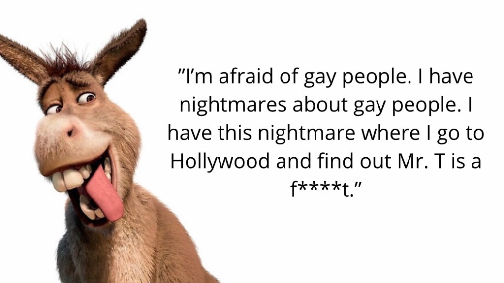 Twitter is enraged and disappointed after Donkey from Shrek was caught calling a podcast host a “f****t” last week, and now, PC culture is doing everything they can to uncover his past homophobic mistakes.
